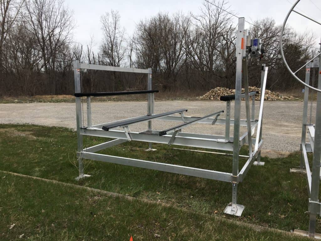 Our lifts utilize an I-beam platform design for strength and reliability, but they are also designed for lower water application and allows the cradle to drop down into the lower framework. This allows our lifts to work as well as V-rack boat lift designs in shallow water while being more light weight.